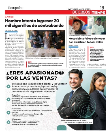 tillas con 20 unidades. El producto El detenido se enfrenta a una pena de varios años de cárcel. El motociclista, Adiel Rodrí- na para brindar asistencia y