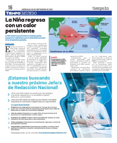 Meteorológica Mundial (OMM), Según los últimos pronósti- aparición de La Niña. que las temperaturas sigan