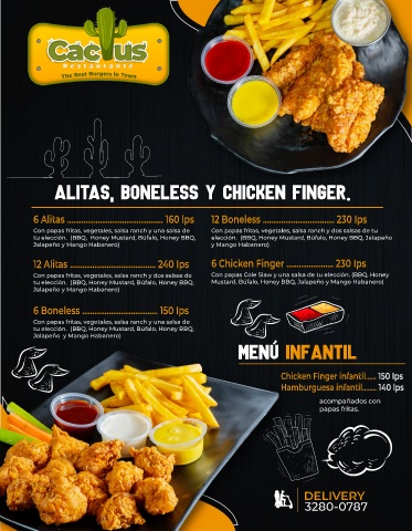 ALITAS, BONELESS Y CHICKEN FINGER.