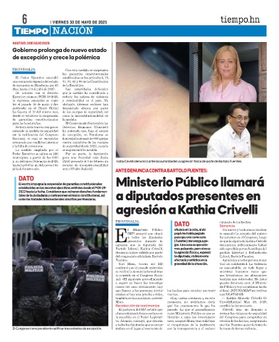 p. m. del lunes 19 de mayo de 2025, (ASJ) presentó el 5 de febrero un Katia Crivelli denunció ante las autoridades la agresión física de parte de Bartolo Fuentes.