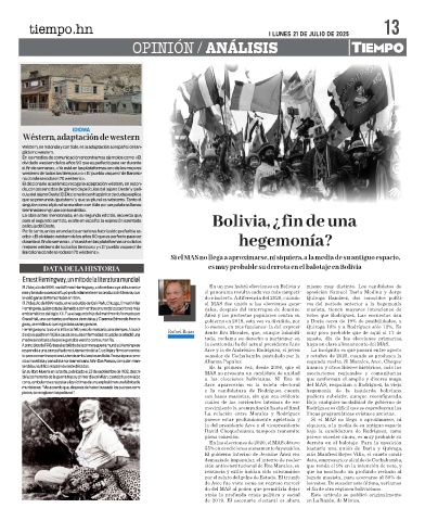 El 21 de julio de 1899, nació Ernest Hemingway, un hombre cuya vida aventu- En un mes habrá elecciones en Bolivia y mismo muy distinto. Los candidatos de