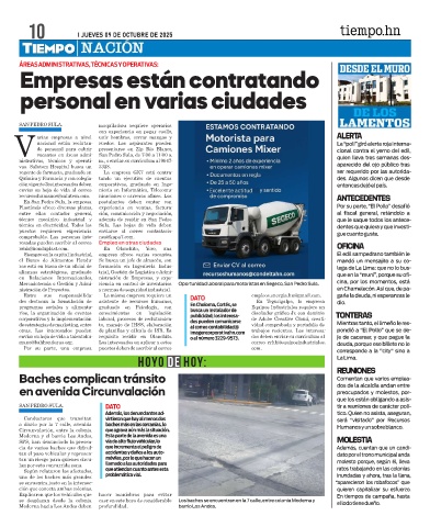 V vacantes en áreas admi- San Pedro Sula, de 7:00 a 11:00 a. quien lleva tres semanas des-