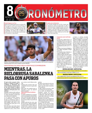'Carlitos' Alcaraz sigue adelante como favorito a repetir el título de Wimbledon; de momento, el español inmediato (4-4). Sabalenka volvería a de entrenamiento, aumentando los
