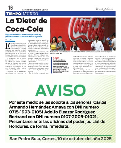 "Coca-Cola, que es el principal calorías. litros, la más grande de sus impuesto a las bebidas azucara- tes, hipertensión y obesidad entre