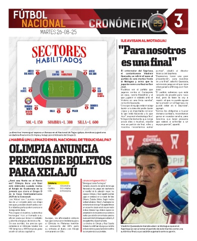 150 lempiras y 600 lempiras para su entrada al duelo con Xelajú en lo económico y para mantener con ritmo Saprissa se van a tomar el partido de este martes como una