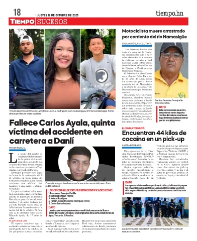 Tres de las cinco víctimas del accidente: Joshua Rodríguez, Daniela Banegas y Emmanuel Banegas. Fotos uno con golpes y en estado de Este suceso ocurre en un con-