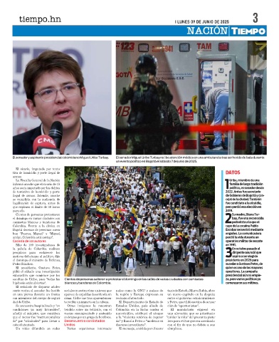El senador y aspirante presidencial colombiano Miguel Uribe Turbay. El senador Miguel Uribe Turbay recibe atención médica en una ambulancia tras ser herido de bala durante
