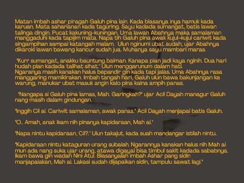 "Inggih Cil ai. Cariwit samalaman, awak panas." Acil Dayah menjapai batis Galuh.