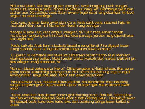 "Nah am, bisa ai datang situ, Nak ai." Ditilantangakan si Galuh di atas tikar purun