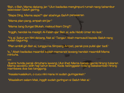 "Bah, o Bah, Mama datang, jar." Ulun badadas menyimpuni rumah nang tahambur