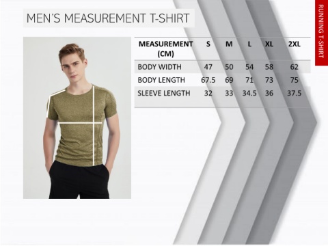 MEN’S MEASUREMENT T-SHIRT MEASUREMENT S M L XL 2XL RUNNING T-SHIRT (CM) RUNNING T-SHIRT BODY WIDTH 47 50 54 58 62 BODY LENGTH 67.5 69 71 73 75 SLEEVE LENGTH 32 33 34.5 36 37.5