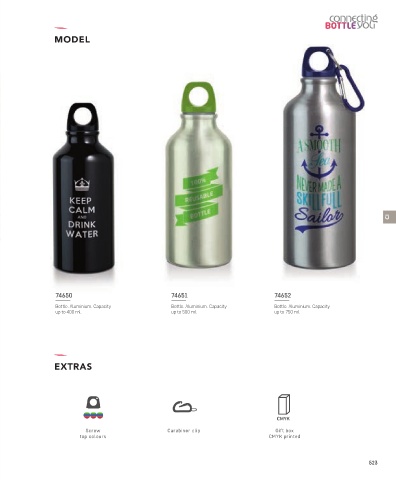 MODEL CI 74650 74651 74652 Bottle. Aluminium. Capacity Bottle. Aluminium. Capacity Bottle. Aluminium. Capacity up to 400 ml. up to 500 ml. up to 750 ml. EXTRAS Screw Carabiner clip Gift box top colours CMYK printed 523