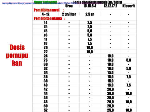 Umur (minggu) Jenis dan dosis pupuk (gr/bibit)