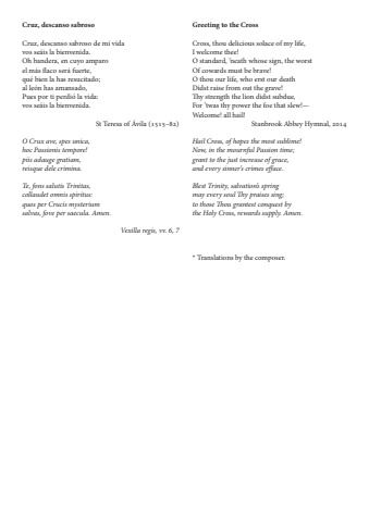 Cruz, descanso sabrosoCruz, descanso sabroso de mi vidavos se%u00e1is la bienvenida.Oh bandera, en cuyo amparoel m%u00e1s flaco ser%u00e1 fuerte,qu%u00e9 bien la has resucitado;al le%u00f3n has amansado,Pues por ti perdi%u00f3 la vida:vos se%u00e1is la bienvenida.St Teresa of %u00c1vila (1515%u201382)O Crux ave, spes unica,hoc Passionis tempore! piis adauge gratiam,reisque dele crimina.Te, fons salutis Trinitas,collaudet omnis spiritus:quos per Crucis mysteriumsalvas, fove per saecula. Amen.Vexilla regis, vv. 6, 7Greeting to the CrossCross, thou delicious solace of my life, I welcome thee! O standard, %u2019neath whose sign, the worst Of cowards must be brave!O thou our life, who erst our death Didst raise from out the grave!Thy strength the lion didst subdue, For %u2019twas thy power the foe that slew!%u2014Welcome! all hail!Stanbrook Abbey Hymnal, 2014Hail Cross, of hopes the most sublime!Now, in the mournful Passion time; grant to the just increase of grace,and every sinner%u2019s crimes efface.Blest Trinity, salvation%u2019s springmay every soul Thy praises sing;to those Thou grantest conquest bythe Holy Cross, rewards supply. Amen.* Translations by the composer.