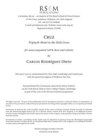 Cathedral Music %u2013 an imprint of The Royal School of Church Music19 The Close, Salisbury, Wiltshire, SP1 2EB, EnglandTel: +44 (0)1722 424848 E-mail: press@rscm.com Website: www.rscm.org.ukRegistered charity 312828CruzTriptych-Motet to the Holy Crossfor unaccompanied SATB choir and soloistsbyCarlos Rodr%u00edguez OteroThis piece was co-commissioned by Clare Hall, Cambridge and Continuum with the generous support of Professor Eric Nye.First performed by Continuum, directed by Harry Guthrie, on the 16th March 2024 in Clare College Chapel, Cambridge, as part of the Lent on the Iberian Peninsula programme.All rights reserved. No part of this publication may be reproduced, stored in a retrieval system, or transmitted, in any form or by any means, without the prior permission in writing of the copyright holders, or as expressly permitted by law.Permission to perform this work in public (except in the course of divine worship) should normally be obtained from the Performing Right Society Ltd, 29%u201333 Berners Street, London W1P 4AA, England, or its affiliated Societies in each country throughout the world, unless the owner or the occupier of the premises being used holds a licence from the Society.Permission to make a recording of this work must be obtained in advance from the Mechanical-Copyright Protection Society Ltd, Elgar House, 41 Streatham High Road, London SW16 1ER, England, or its affiliated Societies in each country throughout the world.RSCM Catalogue Number CM1160Printed in Great Britain