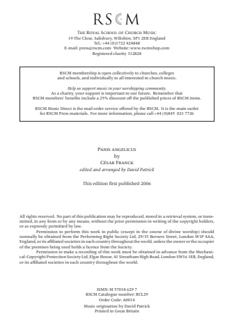 All rights reserved. No part of this publication may be reproduced, stored in a retrieval system, or transmitted, in any form or by any means, without the prior permission in writing of the copyright holders, or as expressly permitted by law.Permission to perform this work in public (except in the course of divine worship) should normally be obtained from the Performing Right Society Ltd, 29/33 Berners Street, London W1P 4AA, England, or its affiliated societies in each country throughout the world, unless the owner or the occupier of the premises being used holds a licence from the Society.Permission to make a recording of this work must be obtained in advance from the Mechanical-Copyright Protection Society Ltd, Elgar House, 41 Streatham High Road, London SW16 1ER, England, or its affiliated societies in each country throughout the world.The Royal School of Church Music19 The Close, Salisbury, Wiltshire, SP1 2EB EnglandTel.: +44 (0)1722 424848E-mail: press@rscm.com Website: www.rscmshop.comRegistered charity 312828Music origination by David PatrickPrinted in Great BritainRSCM membership is open collectively to churches, colleges and schools, and individually to all interested in church music.Help us support music in your worshipping community.As a charity, your support is important to our future. Remember that RSCM members%u2019 benefits include a 25% discount off the published prices of RSCM items.RSCM Music Direct is the mail order service offered by the RSCM. It is the main outlet for RSCM Press materials. For more information, please call +44 (0)845 021 7726ISMN: M 57018 629 7RSCM Catalogue number: RCL29Order Code: A0014Panis angelicusbyC%u00e9sar Franckedited and arranged by David PatrickThis edition first published 2006