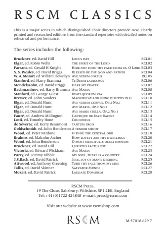 12RSCM CLASSICSRSCM Press,19 The Close, Salisbury, Wiltshire, SP1 2EB, EnglandTel: +44 (0)1722 424848 e-mail: press@rscm.comVisit our website at www.rscmshop.comThis is a major series in which distinguished choir directors provide new, clearly printed and researched editions from the standard repertoire with detailed notes on rehearsal and performance. The series includes the following:Bruckner, ed. David Hill Locus iste RCL01Elgar, ed. Robin Wells The spirit of the Lord RCL02Farrant, ed. Gerald H Knight Hide not thou thy face from us, O Lord RCL03S. S. Wesley, ed. David Briggs Blessed be the God and Father RCL04W. A. Mozart, ed. William Llewellyn Ave, verum corpus RCL05Stanford, ed. Harry Bramma Te Deum laudamus RCL06Mendelssohn, ed. David Briggs Hear my prayer RCL07Rachmaninov, ed. Harry Bramma Ave Maria RCL08Stanford, ed. George Guest Beati quorum via RCL09Brewer, ed. John Sanders Magnificat and Nunc dimittis in D RCL10Elgar, ed. Donald Hunt Ave verum corpus, Op.2 No.1 RCL11Elgar, ed. Donald Hunt Ave Maria, Op.2 No.2 RCL12Elgar, ed. Donald Hunt Ave maris stella, Op.2 No.3 RCL13Faur%u00e9, ed. Andrew Millington Cantique de Jean Racine RCL14Lotti, ed. Timothy Hone Crucifixus RCL15de S%u00e9verac, ed. Kerry Beaumont Tantum ergo RCL16Goldschmidt, ed. John Henderson A tender shoot RCL17Wood, ed. Peter Nardone O Thou the central orb RCL18Brahms, ed. Malcolm Archer How lovely are thy dwellings RCL20Wood, ed. John Henderson O most merciful & oculi omnium RCL21Bruckner, ed. David Hill Christus factus est RCL22Victoria, ed. Edward Wickham Ave Maria RCL23Parry, ed. Jeremy Dibble My soul, there is a country RCL24J.S.Bach, ed. David Patrick Jesu, joy of man%u2019s desiring RCL25Attwood, ed. Anthony Greening Turn thy face from my sins RCL26Tallis, ed. David Skinner Salvator Mundi RCL27Mozart, ed. David Patrick Laudate Dominum RCL28M 57018 629 7