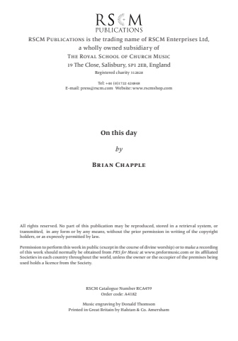 RSCM Publications is the trading name of RSCM Enterprises Ltd, a wholly owned subsidiary ofThe Royal School of Church Music19 The Close, Salisbury, sp1 2eb, EnglandRegistered charity 312828Tel: +44 (0)1722 424848E-mail: press@rscm.com Website: www.rscmshop.comOn this daybyBrian ChappleAll rights reserved. No part of this publication may be reproduced, stored in a retrieval system, or transmitted, in any form or by any means, without the prior permission in writing of the copyright holders, or as expressly permitted by law.Permission to perform this work in public (except in the course of divine worship) or to make a recording of this work should normally be obtained from PRS for Music at www.prsformusic.com or its affiliated Societies in each country throughout the world, unless the owner or the occupier of the premises being used holds a licence from the Society.RSCM Catalogue Number RCA459Order code: A4182Music engraving by Donald ThomsonPrinted in Great Britain by Halstan & Co. Amersham