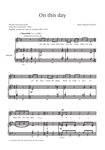 {{{Words: Personent hodiefrom Piae Conationes, 1 582English version by Jane M. Joseph 1 894%u20131 929Cheerfully (q = c.1 08)%u00a9 Copyright 2025 The Royal School of Church Music.Music: BRIAN CHAPPLEOn this dayORGAN47444444242424242424444444242424444444SOPRANOS & ALTOS%u2211Onfthis day earth shall ring with the song child %u2211ren singf mf?#Ped.%u2211 %u2211 %u2211To the Son, Christ the King. Born on earth to save us,f?#mf%u2211 %u2211Him the Fa %u2211ther gave us. Imf%u2211 de %u2211 o, o, o,f mf?#non leg.%u0153 %u0153 %u0153 %u0153 %u0153 %u0153 %u0153 %u0153 %u0153 %u0153 %u0153 %u0153 %u0153%u0153%u0153%u0153 %u0152 %u0153%u0153 %u0152 %u02d9%u02d9 %u0152 %u0153%u0153%u0153 %u0153%u0153%u0153 %u0152 %u0152 %u0153%u0153%u0152%u0153%u0153%u0153 %u0153%u0152%u0152%u0153%u0153%u0153%u0153%u0152 %u00d3 %u0152 %u0153%u0153%u0153 %u0153%u0153 %u0152 %u0152 %u0153%u0153%u0153 %u0153 %u0153 %u0153 #%u0153 %u0153 %u0153 %u0153 %u0153 %u0153 %u0153 %u0153%u0153%u0153 %u0152 %u02d9%u02d9 %u0152 %u0153%u0153%u0153 # %u0153%u0153%u0153 %u0152 %u0153%u0153 %u0153%u0153%u0152%u0153%u0153%u0153%u0153%u0152 %u00d3 %u0152 %u0153%u0153 %u0153%u0153 %u0152 %u0153#%u0153 %u0153%u0153%u0153 %u0153 %u0153 %u0153 %u0153 %u0153 %u0152 %u0152 %u0153 %u0153 %u0153 %u0153 %u0153%u0153 %u0153 %u0153 %u0153 %u0153%u0153 %u0152 %u0153#%u0153 %u0152 %u0153%u0153n%u0153 %u0153%u0153%u0153 %u2030 %u0153%u0153%u0153 %u2030 %u0153%u0153%u0153 %u2030 %u0153%u0153%u0153%u00d3 %u0152%u0153%u0153 %u0153%u0152%u0152%u0153%u0153 %u0153%u0152 %u0153 %u0153 %u0153 %u0153 %u0153 %u2030 %u0153 %u2030 %u0153 %u0153 %u2030 %u0153