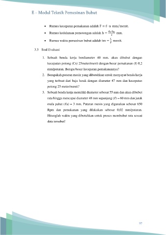 • Rumus waktu pemesinan bubut adalah tm = menit.