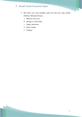 5. Jika benda tirus yang memiliki sudut kecil dan tirus yang pendek sebaiknya dikerjakan dengan . . . a. Memutar eretan atas b. Menggeser kepala lepas c. Tapper attachment d. Eretan lintang e. Champer 77