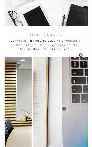 F I N A L T H O U G H T S A L W A Y S B E P R E P A R E D T O S E I Z E A N O P P O R T U N I T Y , W H E T H E R I T ' S O N L I N E O R I N P E R S O N - N E V E R U N D E R E S T I M A T E Y O U R E X P E R I E N C S .