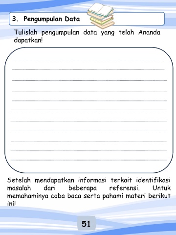 3. Pengumpulan Data Tulislah pengumpulan data yang telah Ananda dapatkan! Setelah mendapatkan informasi terkait identifikasi masalah dari beberapa referensi. Untuk memahaminya coba baca serta pahami materi berikut ini! 51