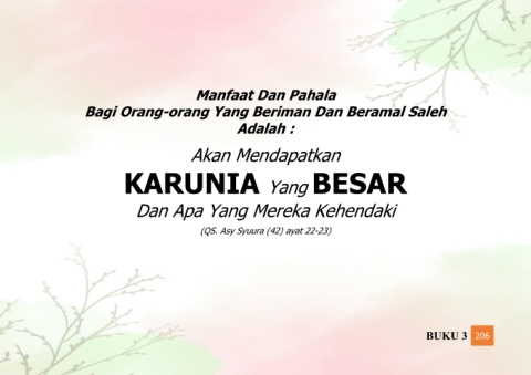 Manfaat Dan Pahala Bagi Orang-orang Yang Beriman Dan Beramal Saleh Adalah : Akan Mendapatkan BESAR KARUNIA Yang Dan Apa Yang Mereka Kehendaki (QS. Asy Syuura (42) ayat 22-23) BUKU 3 206