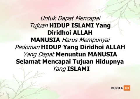 Untuk Dapat Mencapai Tujuan HIDUP ISLAMI Yang Diridhoi ALLAH MANUSIA Harus Mempunyai HIDUP Yang Diridhoi ALLAH Pedoman Yang Dapat Menuntun MANUSIA Selamat Mencapai Tujuan Hidupnya Yang ISLAMI BUKU 4 222