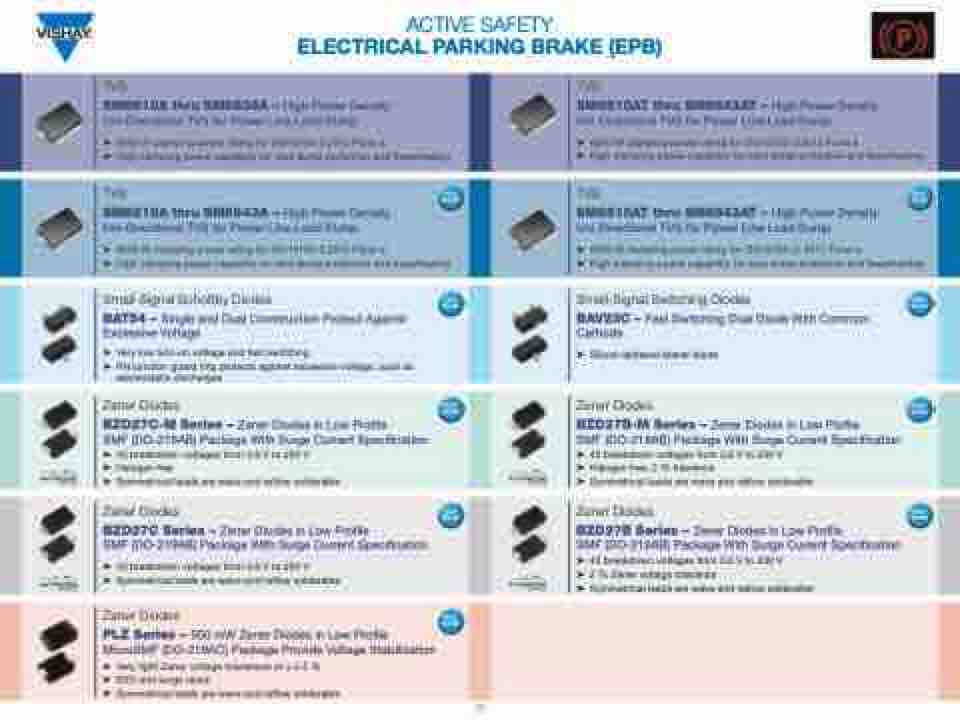 ACTIVE SAFETY ELECTRICAL PARKING BRAKE (EPB) AUTOMOTIVE TVS SM6S10A thru SM6S36A – High Power Density Uni-Directional TVS for Power Line Load Dump ➤ 6000 W clamping power rating for ISO16750-2:2012 Pulse a ➤ High clamping power capability for load dump protection and freewheeling TVS SM8S10A thru SM8S43A – High Power Density Uni-Directional TVS for Power Line Load Dump ➤ 8000 W clamping power rating for ISO16750-2:2012 Pulse a ➤ High clamping power capability for load dump protection and freewheeling Small-Signal Schottky Diodes BAT54 – Single and Dual Construction Protect Against Excessive Voltage ➤ Very low turn-on voltage and fast switching ➤ PN junction guard ring protects against excessive voltage, such as electrostatic discharges Zener Diodes BZD27C-M Series – Zener Diodes in Low Profile SMF (DO-219AB) Package With Surge Current Specification ➤ 43 breakdown voltages from 3.6 V to 200 V ➤ Halogen free ➤ Symmetrical leads are wave and reflow solderable Zener Diodes BZD27C Series – Zener Diodes in Low Profile SMF (DO-219AB) Package With Surge Current Specification ➤ 43 breakdown voltages from 3.6 V to 200 V ➤ Symmetrical leads are wave and reflow solderable Zener Diodes PLZ Series – 500 mW Zener Diodes in Low Profile MicroSMF (DO-219AC) Package Provide Voltage Stabilization ➤ Very tight Zener voltage tolerances of ± 2.5 % ➤ ESD and surge rated ➤ Symmetrical leads are wave and reflow solderable AUTOMOTIVE TVS SM6S10AT thru SM6S43AT – High Power Density Uni-Directional TVS for Power Line Load Dump ➤ 6000 W clamping power rating for ISO16750-2:2012 Pulse a ➤ High clamping power capability for load dump protection and freewheeling TVS SM8S10AT thru SM8S43AT – High Power Density Uni-Directional TVS for Power Line Load Dump ➤ 8000 W clamping power rating for ISO16750-2: 2012 Pulse a ➤ High clamping power capability for load dump protection and freewheeling Small-Signal Switching Diodes BAV23C – Fast Switching Dual Diode With Common Cathode ➤ Silicon epitaxial planar diode Zener Diodes BZD27B-M Series – Zener Diodes in Low Profile SMF (DO-219AB) Package With Surge Current Specification ➤ 43 breakdown voltages from 3.6 V to 200 V ➤ Halogen free, 2 % tolerance ➤ Symmetrical leads are wave and reflow solderable Zener Diodes BZD27B Series – Zener Diodes in Low Profile SMF (DO-219AB) Package With Surge Current Specification ➤ 43 breakdown voltages from 3.6 V to 200 V ➤ 2 % Zener voltage tolerance ➤ Symmetrical leads are wave and reflow solderable GRADE GRADE AUTOMOTIVE AUTOMOTIVE GRADE GRADE - 35 -
