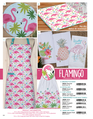 17.5 in x 28 in embroidered flour sack towels • 8 in x 9 in pocket mitt • 14.5 in placemat 15 in x 20 in polyester drying mat