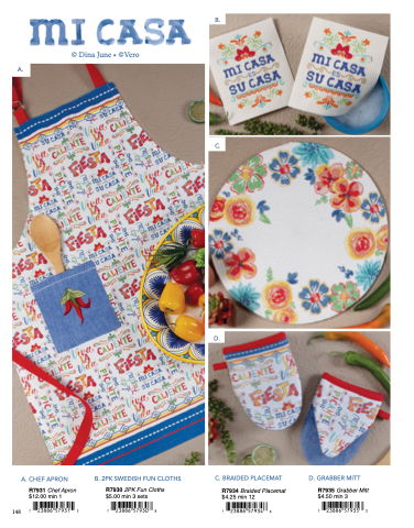 A. © Dina June • ©Vero B. 148 A. CHEF APRON R7931 Chef Apron $12.00 min 1 B. 2PK SWEDISH FUN CLOTHS R7930 2PK Fun Cloths $5.00 min 3 sets C. BRAIDED PLACEMAT R7934 Braided Placemat $4.25 min 12 D. GRABBER MITT R7935 Grabber Mitt $4.50 min 3 C. D.