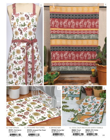 D. E. D. CHEF APRON R7371 Chef Apron $12.00 min 1 E. JACQUARD TEA TOWEL R7376 Jacquard Tea Towel $4.50 min 6 F. DRYING MAT R7922 Drying Mat $4.50 min 3 G. COOL CACTI RECYCLED EARTH TOWELS R8654 Towel R8655 3PK Cloths $6.00 min 3 $5.00 min 3 F. G 153