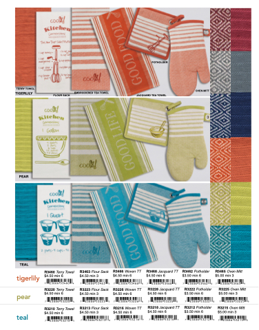 R3220 Terry Towel R3223 Flour Sack R3226 Woven TT R3228 Jacquard TT R3222 Potholder R3225 Oven Mitt $4.50 min 6 $4.50 min 3 $4.50 min 6 $4.50 min 6 $3.50 min 6 $5.00 min 3