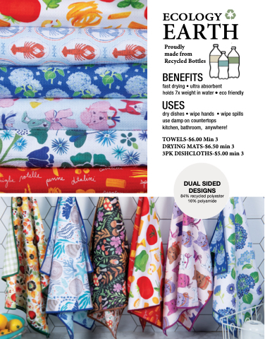 ECOLOGY TPOroWuEdLlyS $6.00 MIN 3 made from Recycled Bottles 18 in x 30 in tow 84% recycled p C TOWELS-$6.00 Min 3 DRYING MATS-$6.50 min 3 3PK DISHCLOTHS-$5.00 min 3 DUAL SIDED DESIGNS 84% recycled polyester 16% polyamide | 3PK DISHC 6 6 Oo L