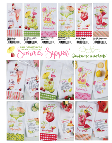 R8434 Bellini $4.50 min 6 R8437 Sweet Life R8435 Lemonade $4.50 min 6 $4.50 min 6 R8433 Margarita $4.50 min 6 R8432 Daiquiri R8436 Watermelon $4.50 min 6 $4.50 min 6 Drink recipe on backside! DUAL PURPOSE TOWELS 16 in x 26 in, 100% cotton 45