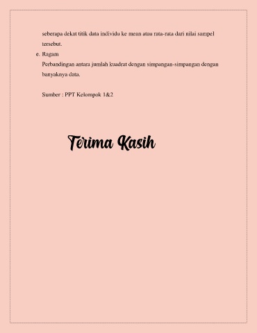seberapa dekat titik data individu ke mean atau rata-rata dari nilai sampel tersebut. e. Ragam Perbandingan antara jumlah kuadrat dengan simpangan-simpangan dengan banyaknya data. Sumber : PPT Kelompok 1&2 Terima Kasih