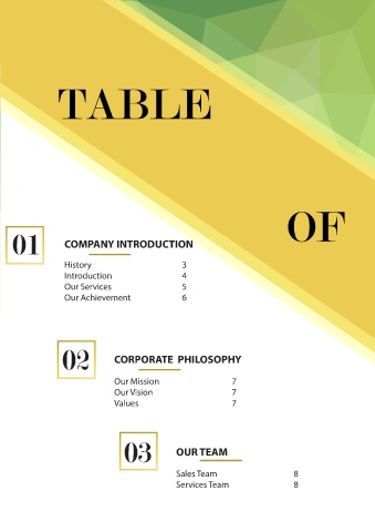 01 COMPANY INTRODUCTION History 3 Introduction 4 Our Services 5 Our Achievement 6 02 CORPORATE PHILOSOPHY Our Mission 7 Our Vision 7 Values 7 03 OUR TEAM Sales Team 8 Services Team 8