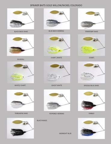 SPINNER BAITS GOLD WILLOW/NICKEL COLORADO BLACK BACK SHAD BLUE BACK HERRING TENNESSEE SHAD CHART./WHITE CHART. BLUEGILL WHITE/ CHART. GHOST WHITE SPECKLE BLUE SHAD THREADFIN SHAD PEPPERED HERRING DIABLO BLACK MAGIC MIDNIGHT BLUE