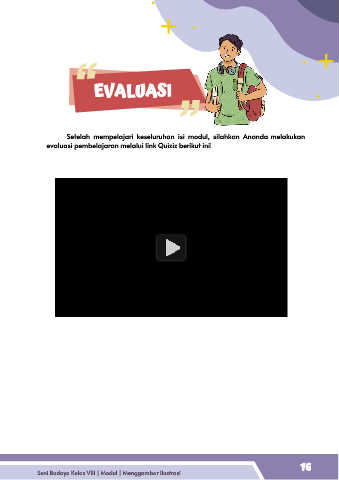 EVALUASI Setelah mempelajari keseluruhan isi modul, silahkan Ananda melakukan evaluasi pembelajaran melalui link Quiziz berikut ini! 16 Seni Budaya Kelas VIII | Modul | Menggambar Ilustrasi