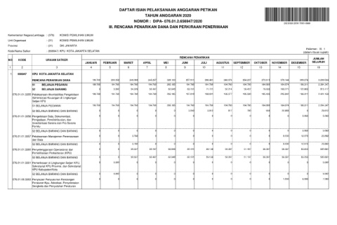 (076) (01) (01) (656947) URAIAN SATKER 3 KPU KOTA JAKARTA SELATAN RENCANA PENARIKAN DANA BELANJA PEGAWAI BELANJA BARANG Pelaksanaan Akuntabilitas Pengelolaan Administrasi Keuangan di Lingkungan 52 BELANJA BARANG DAN BARANG Pengelolaan Data, Dokumentasi, Pengadaan, Pendistribusian, dan Inventarisasi Sarana dan Pra Sarana 52 BELANJA BARANG DAN BARANG Pelaksanaan Manajemen Perencanaan 52 BELANJA BARANG DAN BARANG Penyelenggaraan Operasional d