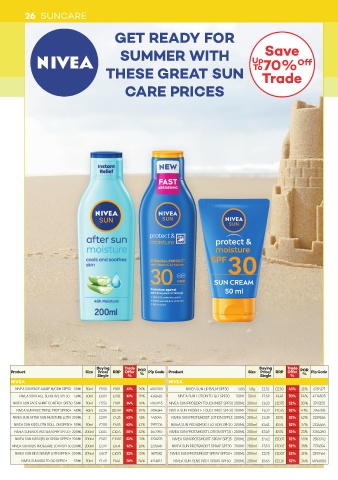 NIVEA SUN KIDS P&S SEN SPRY SPF50+ 200ML 200ml  £6.05  £10.75  50%  32%  3677390  NIVEA SUN PROT&MOIST LOTION SPF50+ 200ML 200ml  £5.49  £8.74  52%  25%  3204260