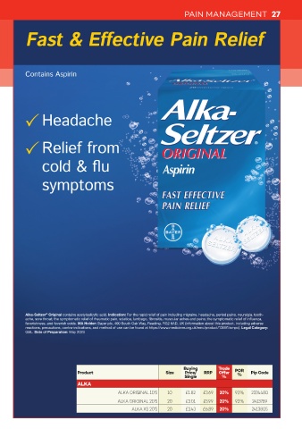 Alka-Seltzer Original contains acetylsalicylic acid. Indication: For the rapid relief of pain including migraine, headache, period pains, neuralgia, tooth-