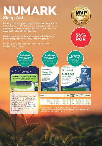 needs moving across to SLEEP AID 25MG NUMARK 20 20 £1.46 £3.99 56.09% 2249001