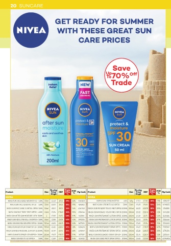 NIVEA SUN AFTER SUN MOISTURE LOTN 200ML 1 £2.09 £4.25 43% 41% 443044 NIVEA SUN PROT&MOIST LOTION SPF15 200ML 200ml £4.19 £8.74 52% 42% 2139186