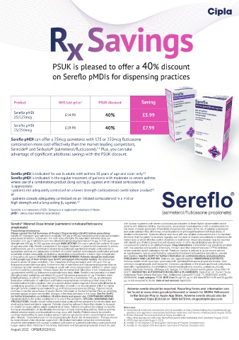 μg salmeterol and 50 μg fluticasone propionate twice daily. Note: Sereflo is not available in a lower SmPC. MARKETING AUTHORISATION HOLDER & PL NUMBERS: Cipla (EU) Ltd. Dixcart House,