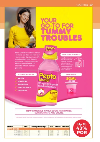 GASTRO 47 Up To Product Size Buying Price/Single RRP POR % Pip Code 43% PEPTO BISMOL PEPTO BISMOL 120ml £3.10 £4.90 24% 455576 POR PEPTO BISMOL 240ml £4.24 £9.00 43% 2114320 PEPTO BISMOL 480ml £8.48 £13.50 25% 2974533