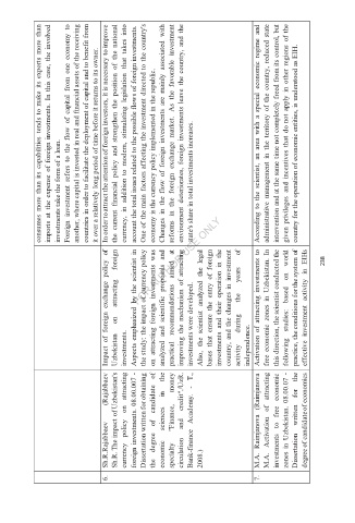 Sh.R.Rajabbaev Sh.R. The impact of Uzbekistan's currency policy foreign investments. 08.00.007 - Dissertation written for obtaining the degree of candidate sciences economic specialty and circulation Bank-finance Academy. 2008.) M.A. Raimjanova M.A. Activation of attracting investments to zones