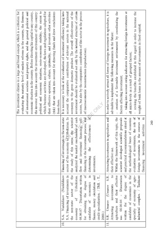 10. S.A. Nuriddinov S.A. Financing of investments in non-state sector of the of economy 08.00.07 - for obtaining candidate of finance, money circulation credit specialization. / TMI. - T., 2000.) 11. S.R. Umarov Attracting agriculture and use. 08.00.04 written for candidate of