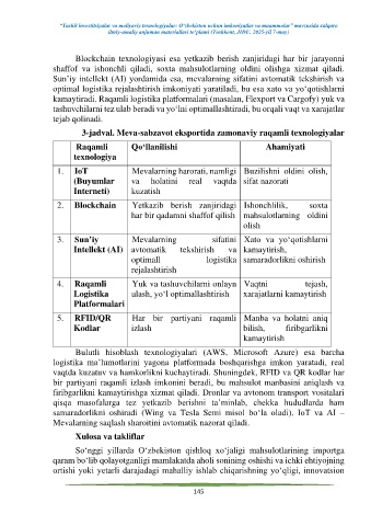 3-jadval. Meva-sabzavot eksportida zamonaviy raqamli texnologiyalar